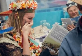 Играйте, не выходя из офиса! Ведущий приедет к вам, привезет всё необходимое и превратит привычный интерьер в бал-маскарад, серию Санта-Барбары, ковбойский салун или необитаемый остров. Вам нужно только собрать коллег, подготовить угощение и впустить к себе праздник.